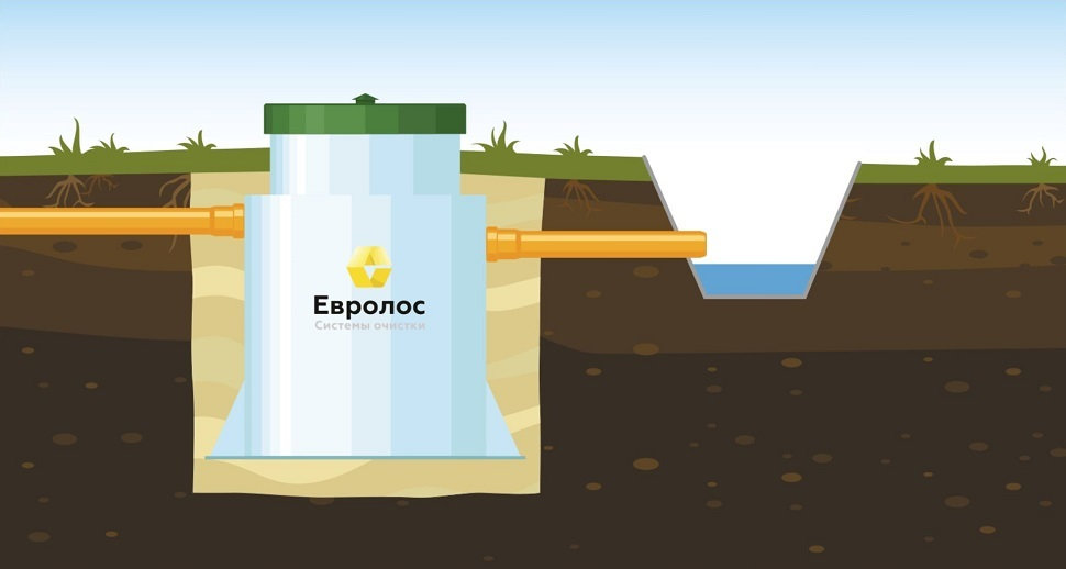 Вариант самотечного отвода очищенной воды в канаву из септика Евролос