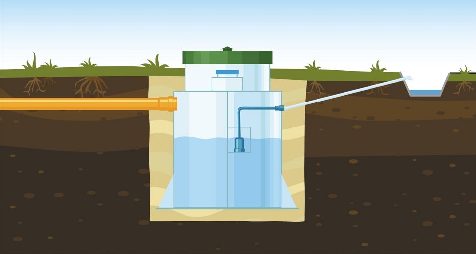 Вариант принудительного отвода очищенной воды в канаву из септика Евролос